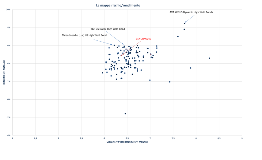 L’AXA US Dynamic High Yield Bonds investe in titoli obbligazionari ad alto rendimento in dollari, seguendo come benchmark l’indice ICE BofA US HighYield. Lo stile di gestione è piuttosto attivo sia nell’esposizione al rischio tasso che al rischio credito, con scostamenti abbastanza significativi dal benchmark, seppur non radicali: ad esempio all’inizio di dicembre il fondo area meno esposto al rischio tasso rispetto al benchmark, ma maggiormente se consideriamo il rischio credito: la modified duration media del portafoglio era pari a 2,65 contro il 2,92 dell’indice, mentre il rendimento media a scadenza era molto più alto, 8,29% rispetto a 6,75%. Il fondo era infatti sottopesato significativamente sui titoli BB a favore dei titoli con rating B e CCC.