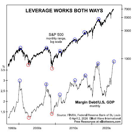 Sono molteplici i segnali di pericolo che giustificano un approccio prudente al mercati azionari: tra questi l'esposizione degli investitori al credito per l'acquisto di azioni su livelli estremi, come mostrato dal grafico di ElliottWave in basso.
