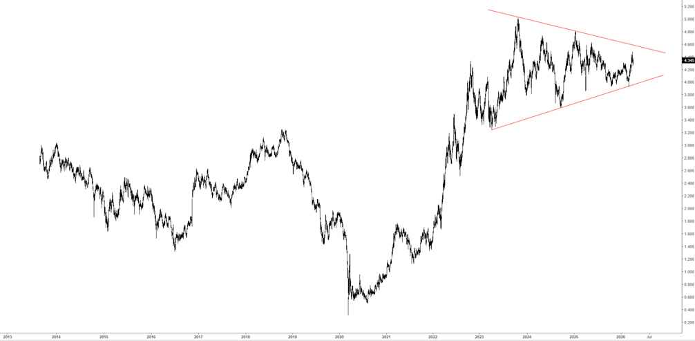 Il rendimento del Treasury decennale intorno al 4,35% rimane al momento all'interno di un triangolo con notevoli implicazioni rialziste in caso di superamento di quota 4,5% (grafico in basso) con proiezioni ampiamente sopra al 5%.