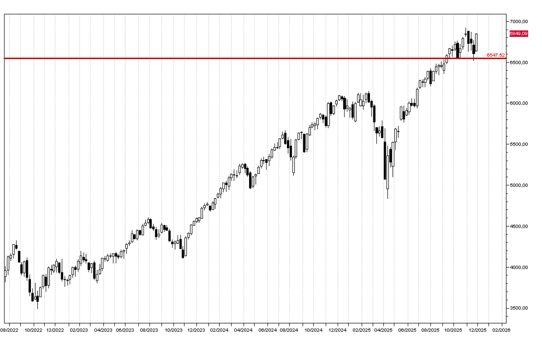 La posizione tecnica degli indici americani rimane in estremo ipercomprato e continua a suggerire prudenza nell’esposizione rialzista, ma mancano ancora segnali di fine trend: l’indice S&P 500 ha testato nuovamente l’importante supporto a quota 6.550 punti, rimbalzando per la quinta volta.
