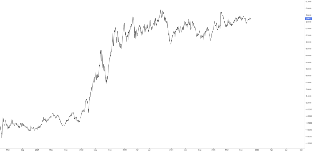 Le dichiarazioni di alcuni esponenti della Fed hanno alimentato le aspettative di un taglio dei tassi a metà dicembre, ma i rendimenti a lungo termine sono scesi solo marginalmente: il rendimento del Treasury decennale ha chiuso il mese al 4,02% (grafico in basso), quello del Bund al 2,69% e quello del BTP decennale al 3,40%.