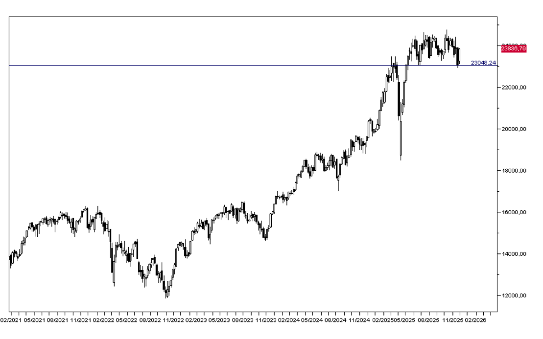 Anche il DAX tedesco rimane sopra il primo importante supporto e pertanto è ancora presto per attendersi discese significative (grafico in basso).