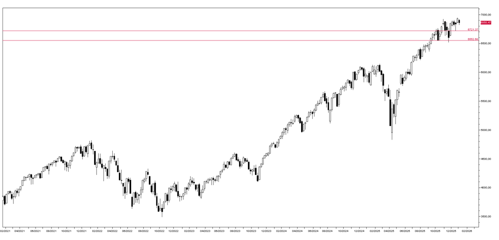 L’indice S&P 500 ha chiuso l’anno a quota 6845 punti (grafico in basso).
