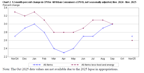 Non sembrano esserci al momento motivi per attendersi movimenti significativi in un senso o nell’altro: i dati macro non mostrano variazioni rilevanti né per i tassi di inflazione in Europa e negli Stati Uniti né per quelli di crescita. L'inflazione USA di novembre è scesa al 2,7% (grafico in basso).