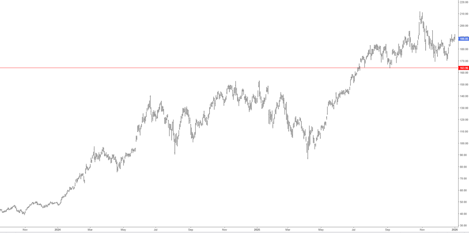 Mancano tuttavia segnali di inversione del trend rialzista, che può quindi proseguire anche nel primo trimestre dell’anno. È da monitorare il supporto a 6550 per l’indice S&P 500, chiudendo eventuali posizioni rialziste in caso di discesa sotto tale livello. Per il titolo principale del mercato americano, NVIDIA, il livello da monitorare è quota 163 dollari (grafico in basso).