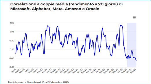 Negli ultimi anni, i grandi hyperscaler (società che forniscono infrastrutture e servizi di cloud computing su ampia scala) hanno tendenzialmente mostrato un andamento simile, seguendo lo stesso percorso di ascesa e caduta. Tuttavia, il trading guidato dall'IA non è più un monolite. Ne vediamo il riflesso nella correlazione media dei rendimenti tra i cinque principali hyperscaler, ossia Microsoft, Alphabet, Meta, Amazon e Oracle. La correlazione è stata tendenzialmente molto positiva per gran parte dell'ultimo decennio, ma di recente si è avvicinata allo zero (vedere il grafico seguente).