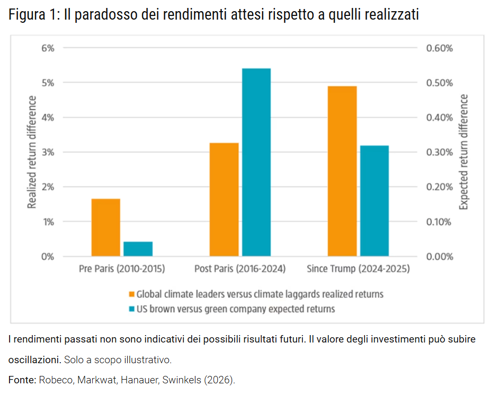In altri termini, i titoli “brown” possono sottoperformare semplicemente perché il mercato è meno propenso a detenerle, e non necessariamente a causa di utili deludenti. Paradossalmente, una volta che il maggior costo del capitale è stato pienamente scontato, la teoria prevede l’effetto opposto: le aziende “brown” dovrebbero finire per ottenere rendimenti più elevati, compensando gli investitori per il maggiore rischio climatico. È ciò che alcuni studiosi chiamano premio per il rischio carbonio.