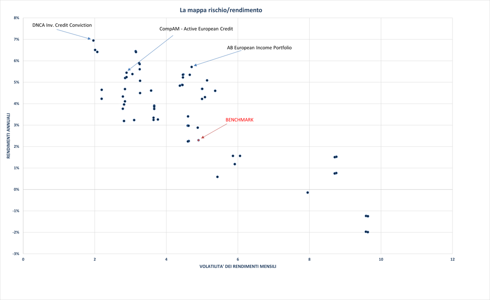 Il fondo DNCA Invest Credit Conviction investe in titoli obbligazionari europei e “mira a sovraperformare l’indice Bloomberg Euro-Aggregate Corporate”, pur investendo in emissioni europee non dell’area Euro, come ad esempio quelle britanniche. E’ incluso nella categoria dei fondi Obbligazionari Europa Diversificati e non in quelle Corporate in quanto il fondo può investire anche in titoli di Stato e anche in titoli ad alto rendimento, anche se le emissioni con rating inferiore a B+ non possono superare il 10% del portafoglio. Il fondo può investire sino al 50% in emissioni in sterline e dollari, ma con la copertura del rischio cambio contro la valuta della classe e l’esposizione valutaria non può superare il 10% del totale. Il fondo può poi investire sino al 20% in obbligazioni convertibili e sino al 60% in debiti subordinati. All’inizio di dicembre il portafoglio era interamente investito in titoli Corporate con un peso intorno al 20% dei titoli Non Investment Grade ad alto rendimento. I titoli subordinati avevano un peso del 17,6% e le convertibili del 5%. La modified duration del portafoglio era pari a 4,47 per una scadenza media di 5,29 anni e un rendimento a scadenza del 3,83%.