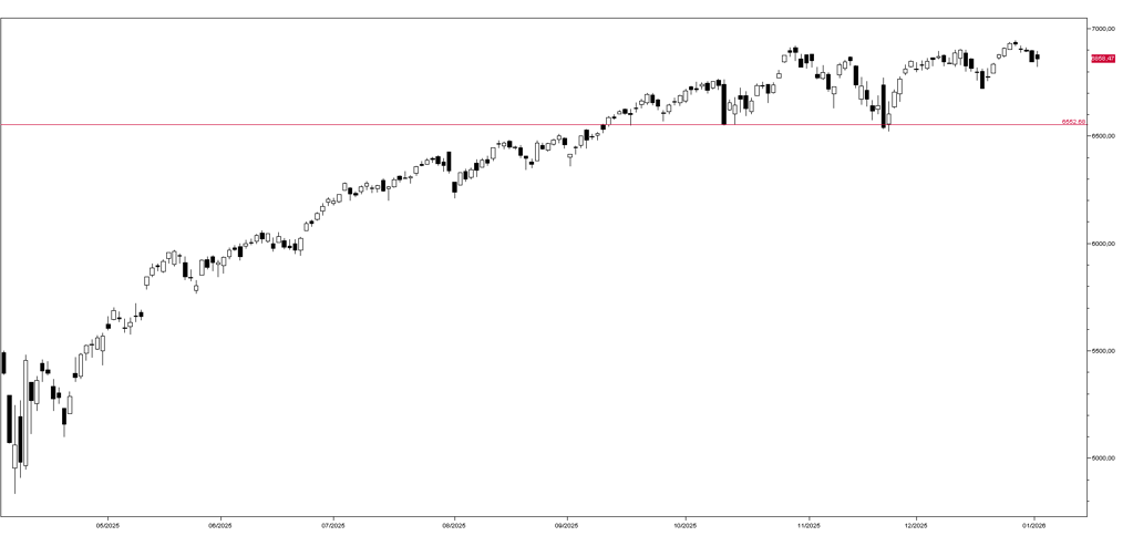 L'ultima settimana dell'anno ha visto il mercati azionari europei particolarmente euforici con Madrid in rialzo dell'1,86% e Milano dell'1,72% come l'indice Stoxx europeo, mentre gli indici americani hanno chiuso in ribasso: l'SP500 ha perso l'1,03% (grafico in basso), come il Russell 2000 dei titoli a minore capitalizzazione, e il Nasdaq 100 l'1,71% per colpa di qualche tecnologico in ribasso come Microsoft che venerdì ha perso il 2,2% finendo a 472,94 dollari, lontano dal massimo a 553 dello scorso novembre.