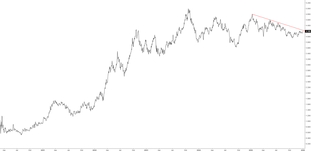 I rendimenti dei decennali americani ed europei hanno aperto l'anno all'interno delle trading range degli ultimi mesi con il Treasury decennale fermo al 4,19% (grafico in basso) e quello del Bund al 2,90%: in leggera salita quello del BTP decennale al 3,57%.
