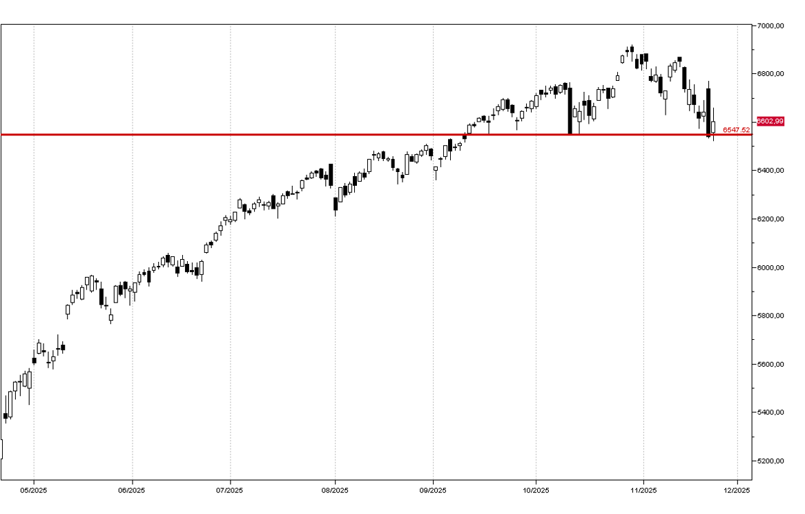 Anche l’indice S&P 500 ha tentato la rottura al ribasso del primo importante supporto a 6.550 punti (grafico in basso), ma si è salvato in chiusura di settimana: una ridiscesa sotto questo livello nei prossimi giorni sarebbe però un segnale di inversione significativo e consiglierebbe prudenza nell’esposizione azionaria.