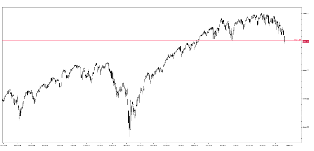 La posizione tecnica dell’indice S&P 500 è peggiorata sensibilmente, con la chiusura di venerdì sotto il primo importante supporto situato a quota 6520 (grafico in basso), ed è essenziale che tale livello venga recuperato in apertura di settimana per impedire un’estensione del movimento ribassista degli ultimi giorni. Le perdite dell’indice da inizio anno sono sinora modeste, intorno al 3,5%, nonostante il rialzo del greggio e i problemi del settore del private debt: una correzione più ampia non dovrebbe sorprendere.