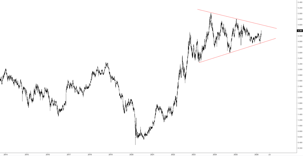 La riunione della Federal Reserve non ha portato variazioni dei tassi, mentre è proseguito il rialzo dei rendimenti obbligazionari, legato ai timori di una ripresa delle pressioni inflazionistiche: il rendimento del Treasury decennale ha chiuso la settimana al 4,39% (grafico in basso), massimo dallo scorso luglio; quello del Bund al 3,03% e quello del BTP decennale al 3,97%.