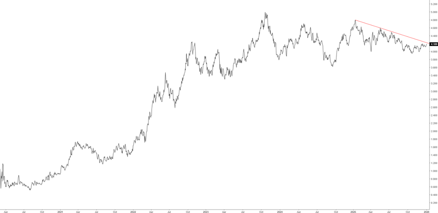 I rendimenti obbligazionari a lungo termine sono fermi da mesi all’interno di trading range ridotti, con il Treasury decennale stabile al 4,19% (grafico in basso) e quello del Bund al 2,90%; poco mosso anche il BTP decennale al 3,57%. Prosegue invece il rialzo dei rendimenti dei titoli di Stato giapponesi, con quello del trentennale vicino al massimo storico del 3,5%.