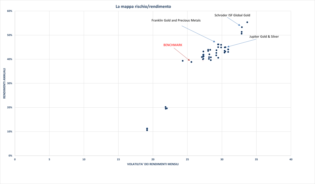 La performance media annua in euro della classe retail A nei tre anni a fine 2025 è stata del 46,15%, tre le migliori della categoria. La volatilità dei rendimenti mensili è stata nella media della categoria anche se gli scostamenti dei rendimenti dal benchmark nei vari solari sono stati regolarmente ampi.
