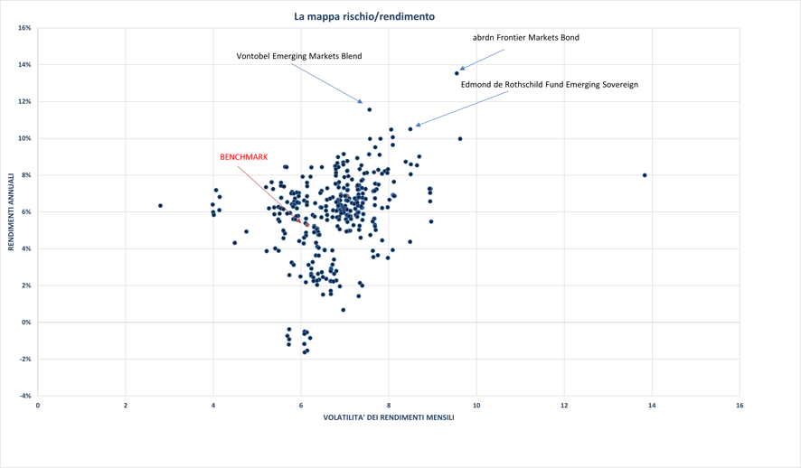 La maggior parte dei fondi utilizza come benchmark l’indice JPM EMBI Diversified che è composto da emissioni governative in dollari, un benchmark con una duration media intorno ai 6,75 anni.