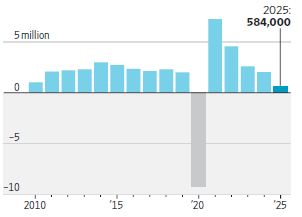 La scorsa settimana l'attenzione degli investitori era puntata sul dato di venerdì della disoccupazione USA di dicembre: il rapporto ha registrato la creazione di 50 mila posti di lavoro, al di sotto del consenso di 60 mila, mentre il tasso di disoccupazione è sceso al 4,4% dal 4,5% di ottobre, dato che è stato rivisto al ribasso dal 4,6%, risultando inferiore alla previsione del 4,5%. Le revisioni nette degli ultimi due mesi sono state pari a -76.000, sebbene i dati di ottobre siano stati influenzati da forti perdite una tantum di posti di lavoro governativi. Nel 2025 l'economia americana ha creato 584 mila posti di lavoro (grafico in basso dal WSJ), dato pubblicato dalla Casa Bianca la sera prima della data di pubblicazione prevista da parte del Bureau of Labor Statistics.