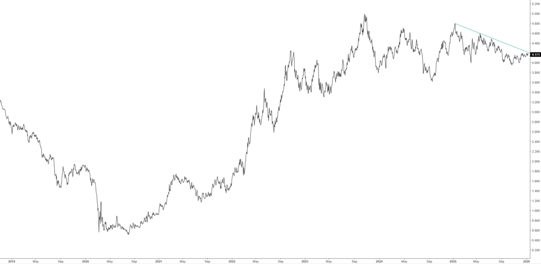 Prosegue il movimento laterale senza trend dei mercati obbligazionari: il Treasury decennale ha chiuso la settimana a 4,18% dal 4,19% del venerdì precedente (grafico in basso) mentre quello del Bund è sceso al 2,83%: in leggera discesa anche quello del BTP decennale al 3,46%.