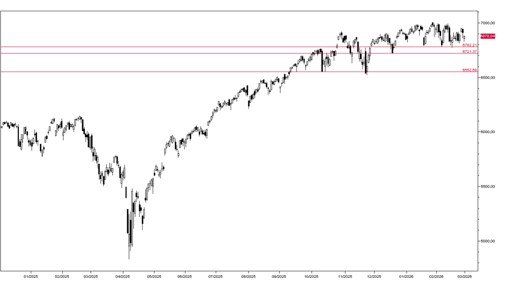 Per quanto riguarda l’indice S&P 500, la fase laterale che prosegue ormai da quattro mesi sembra non esaurirsi, anche se è il risultato di notevoli divergenze tra i singoli titoli. Sono evidenti segnali di debolezza, ma manca ancora la rottura al ribasso della prima area di supporto intorno a quota 6.780 (grafico in basso). Il supporto di lungo termine è situato a quota 6.550 e solo una discesa sotto questo livello giustificherebbe aspettative di inversione del trend rialzista principale.