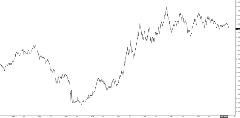 I rendimenti dei titoli decennali in Europa e negli Stati Uniti sono scesi nel corso dell'ultima settimana, con il Treasury decennale al 3,96% (grafico in basso), il Bund al 2,65% e il BTP al 3,28%.